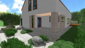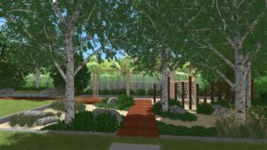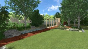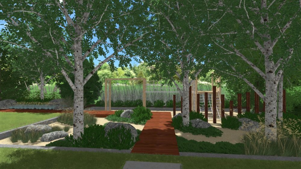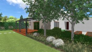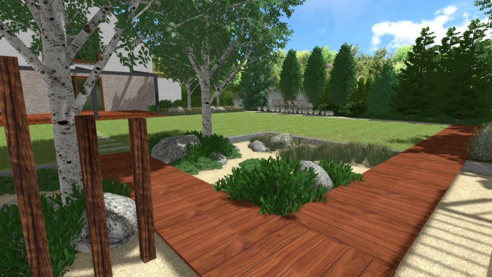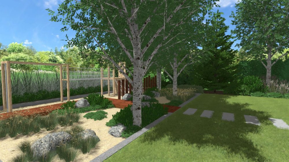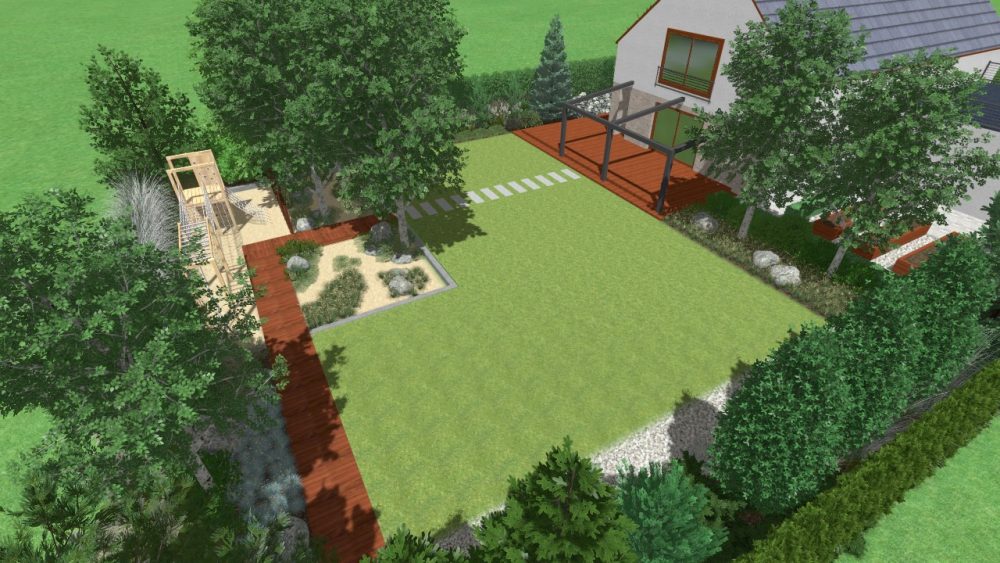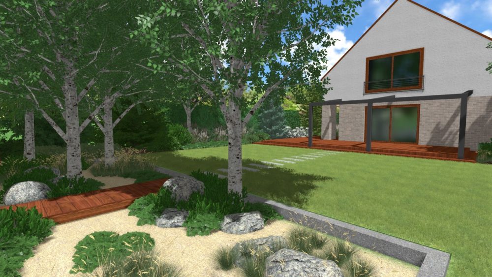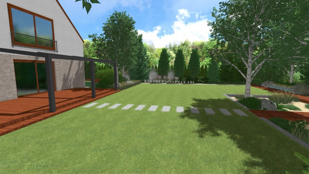 Część tylnia ogrodu to jednocześnie najczęściej użytkowana strefa wokół domu. Znajduje się tutaj rozległy trawnik umożliwiający aktywną rekreację. Całość trawnika otaczają rośliny: krzewy, drzewa i byliny. Stanowią one swoistą ramę ogrodu i ciekawy wizualnie element, który oglądać można z tarasu, będącego najczęściej użytkowaną strefą ogrodu przez Inwestorów. Dominującą rolę głównej części ogrodu zajmuje usytuowana centralnie rabata usytuowana w niewielkim, dwudziestocentymetrowym obniżeniu. Rabata wyścielona zostanie jasnym, sypkim piaskiem, a w niej dominować będą kosodrzewiny, trawy i brzozy o ażurowym pokroju z piękną, białą korą. Przez rabatę przebiega drewniana ścieżka wyniesiona lekko ponad powierzchnię rabaty. Pełni ona rolę nie tylko ścieżki ale i niskiego siedziska w cieniu drzew. Do dwóch brzóz zostanie przymocowany hamak do relaksu w cieniu, w upalne dni. Za brzozową rabatą znajduje się części przeznaczona do zabawy dzieci. Została dodatkowo oddzielona przez drewniane belki wbite pionowo w grunt pełniące funkcję ozdobną będą ciekawym elementem architektury krajobrazu. Przy przestrzeni przeznaczonej dla dzieci znajdują się krzewy owocowe takie jak porzeczka, borówka czy malina. Rośliny w obniżonej rabacie zostały rozplanowane w taki sposób by umożliwić dzieciom swobodne bieganie pomiędzy nimi, a domkiem z elementami wspinaczkowymi dla młodszych użytkowników.