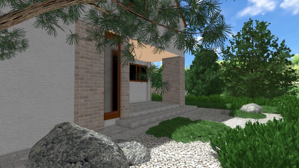 Front projektowanego ogrodu jest wizytówką domu, dlatego zdecydowano się na zastosowanie roślin głównie zimozielonych – atrakcyjnych cały rok. Rabaty wypełnione grysem i roślinami podzielone są przez ścieżkę prowadzącą do drzwi frontowych. Po obu jej stronach znajdują się place wyścielone jasnym grysem i wypełnione takimi roślinami jak kosodrzewina, jałowce czy niskie ozdobne trawy atrakcyjne zwłaszcza latem, jesienią i zimą. Kompozycję uzupełniają, pojawiające się w całości nowoczesnego ogrodu większe kamienie ozdobne. Nad całością góruje niewielkie, wolno rosnące drzewo iglaste o ciekawym parasolowatym pokroju.