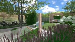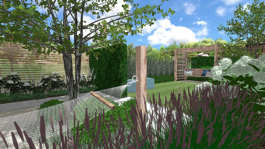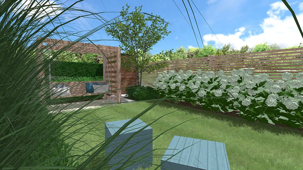 Trzecie wnętrze to część rekreacyjna i jedyna część, w której znalazł się trawnik ograniczony grupą hortensji przed drewnianym panelem i grupą wysokich traw z drugiej strony. Na zakończeniu znalazła się huśtawka wykonana z drewna o nowoczesnej formie małej architektury ogrodowej. Po płytach dojdziemy do schowanej za drzewem drewutni – domku na narzędzia, a obok grupa wysokich bambusów stanowiąca jednocześnie osłonięcie od sąsiadującej działki.