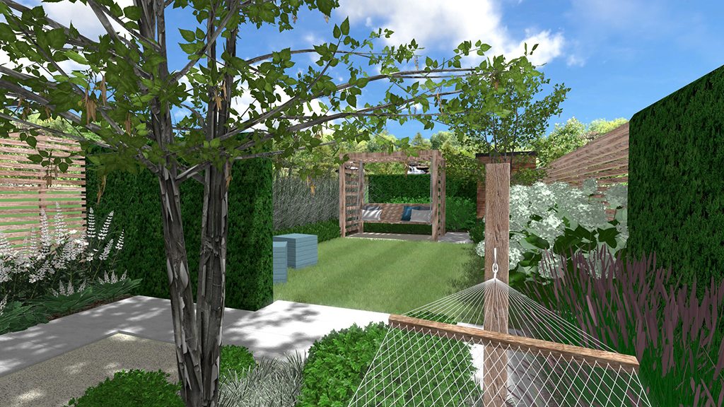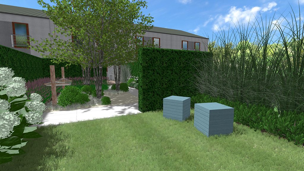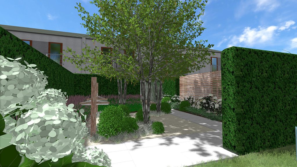 Do drugiego wnętrza przejdziemy po płytach betonowych w odcieniu jasnej szarości/bieli. Tam znajdują się trzy drzewa liściaste o wielopiennej formie podsadzone roślinnością posadzoną w formie niewielkich wysp. W cieniu drzew ustawiono hamak na drewnianych belkach. Zamknięcie tej części wypełnia pas traw ozdobnych.
