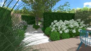 Pierwsze wnętrze w znacznej mierze wypełnia drewniany taras w kolorze drewna nawiązujący do kolorystyki desek w mieszkaniu tak by sprawić wrażenie, że ogród jest nieodłączną częścią domu – jego przedłużeniem. Od sąsiadujących działek taras osłonięty jest przez żywopłot i pas wysokich traw ozdobnych z jednej strony i przez drewniany panel i kwitnące na biało rośliny z drugiej. Przy tarasie zaplanowano kompozycję ozdobnych roślin – hortensji, bukszpanu i bylin z białymi kwiatostanami.