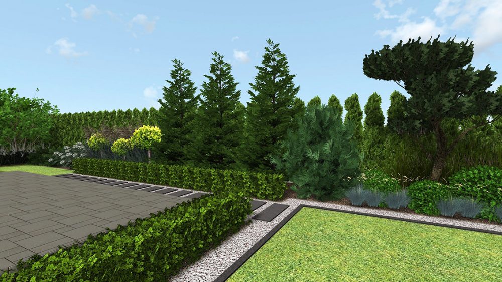 Przestrzeń otaczająca dom mieszkalny została zaprojektowana w stylu nowoczesnym i eleganckim zarazem, nawiązując do architektury budynku i stylu preferowanym przez Inwestorów. Poszczególne strefy w projektowanym ogrodzie zostały podzielone poprzez proste linie poprowadzone pod kątem prostym. Wyznaczyły w ten sposób dużą połać trawnika w kształcie prostokąta otoczonego opaską grysową podkreślając jego kształt i nadając eleganckiego wyrazu.
