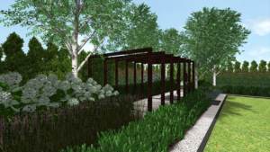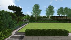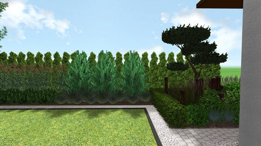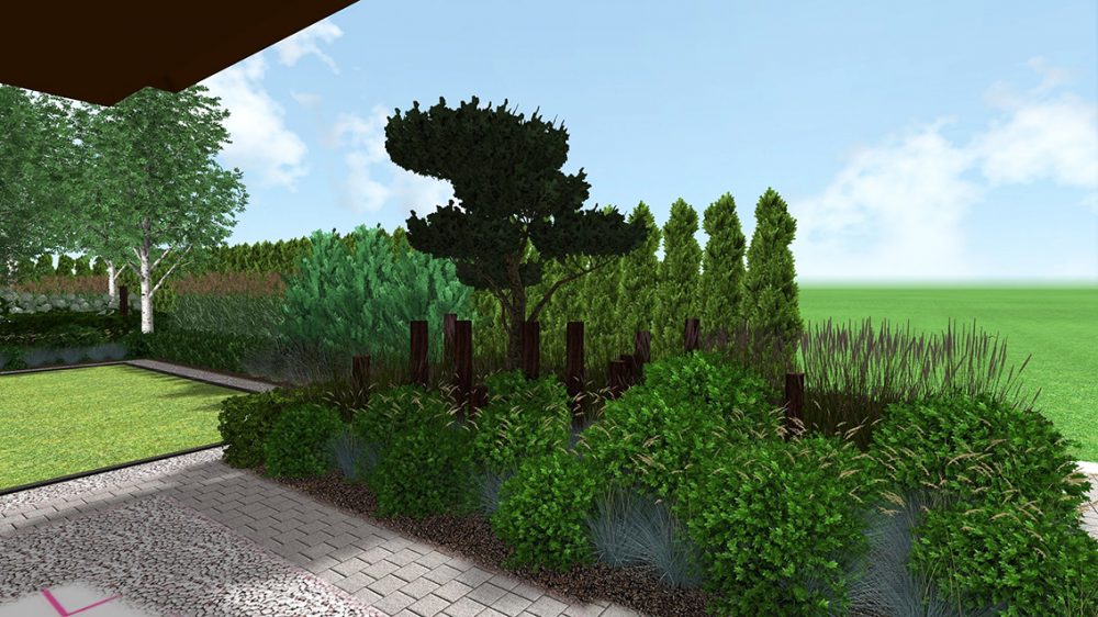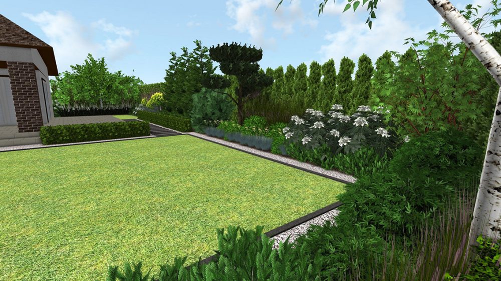 Trawnik otaczają rośliny nasadzone pasowo przełamane trawami i krzewami o luźnej formie. W ogrodzie dominują gatunki zimozielone, trawy ozdobne i krzewy kwitnące na biało – głównie hortensje. Dodatkowy akcent stanowią krzewy iglaste wyprowadzone na pniu osadzone w trawach.