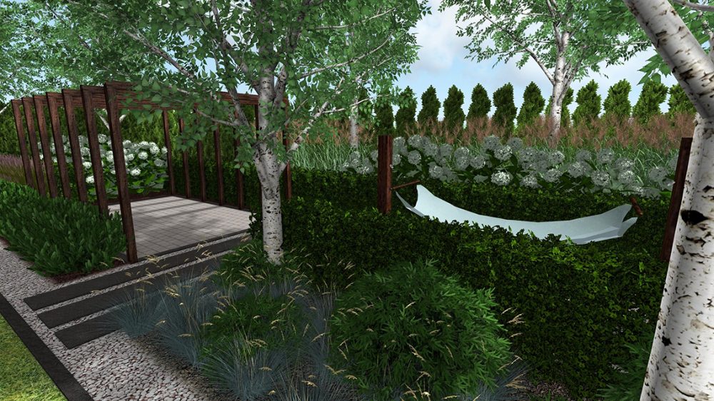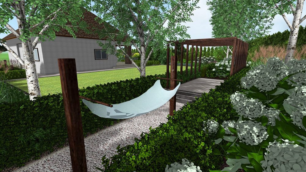 Mimo, że ten nowoczesny ogród pełni funkcję głównie ozdobną to znalazło się w nim także miejsce na element architektury ogrodowej w postaci altany wypoczynkowej i hamaka, schowanego za pasowo nasadzonymi grupami roślin. Altana ma lekką ażurową konstrukcję, a przestrzeń pod nią została utwardzona i służy jako miejsce do biesiadowania. Powierzchnia pod hamakiem wysypana jest grysem dolomitowym, który pojawia się także w innych miejscach ogrodu. Do altany prowadzi ścieżka z płyt betonowych, które zostały zaproponowane także przy istniejącym tarasie.